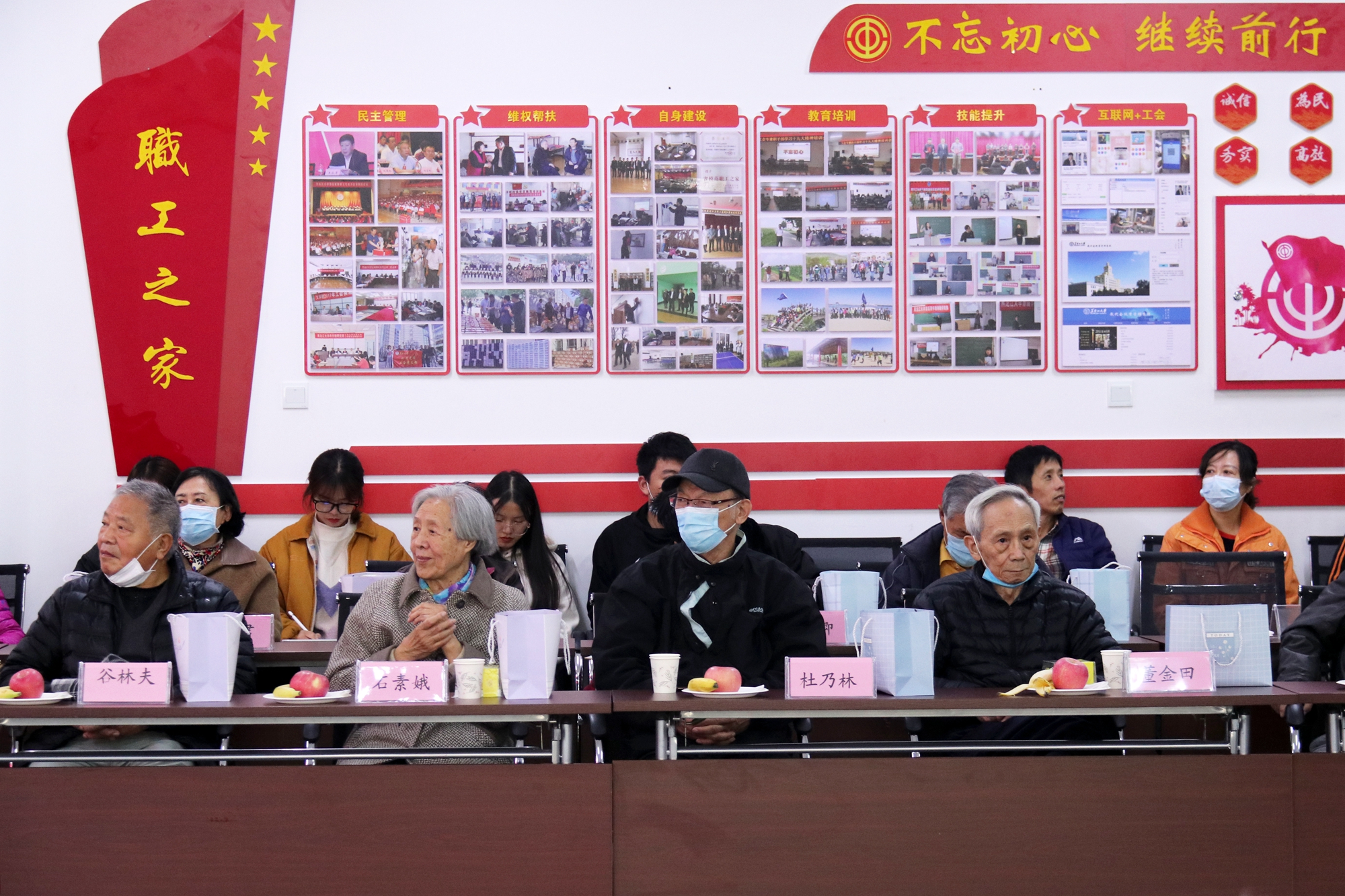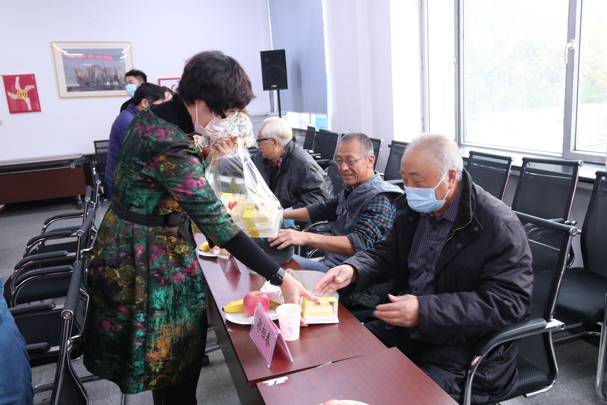 生日会场布置简洁而温馨,每位老同志的桌前都摆放着果盘、蛋糕和热茶,老同志们谈笑着纷纷入座,面前LED屏幕滚动着“福如东海长流水,寿比南山不老松”的美好祝愿。