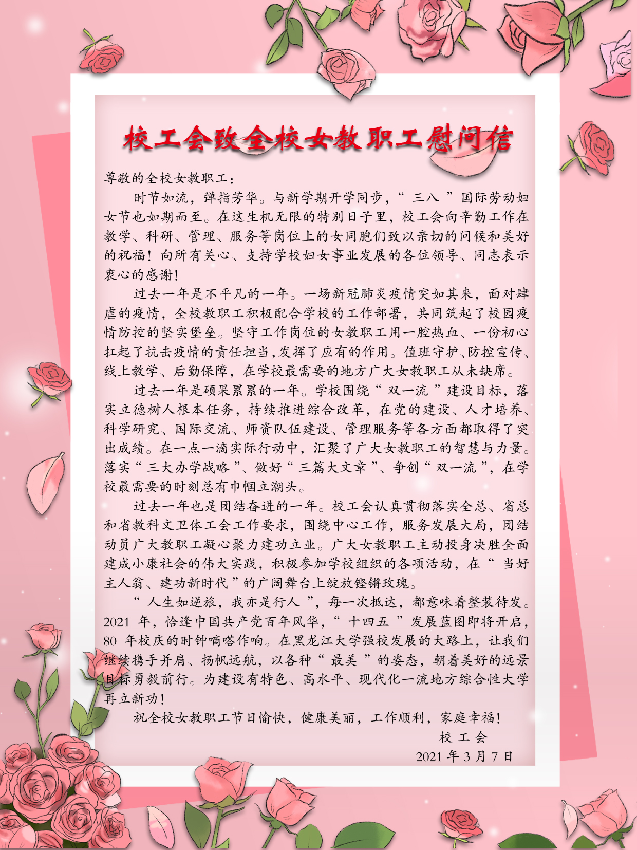 校工会致全校女教职工慰问信