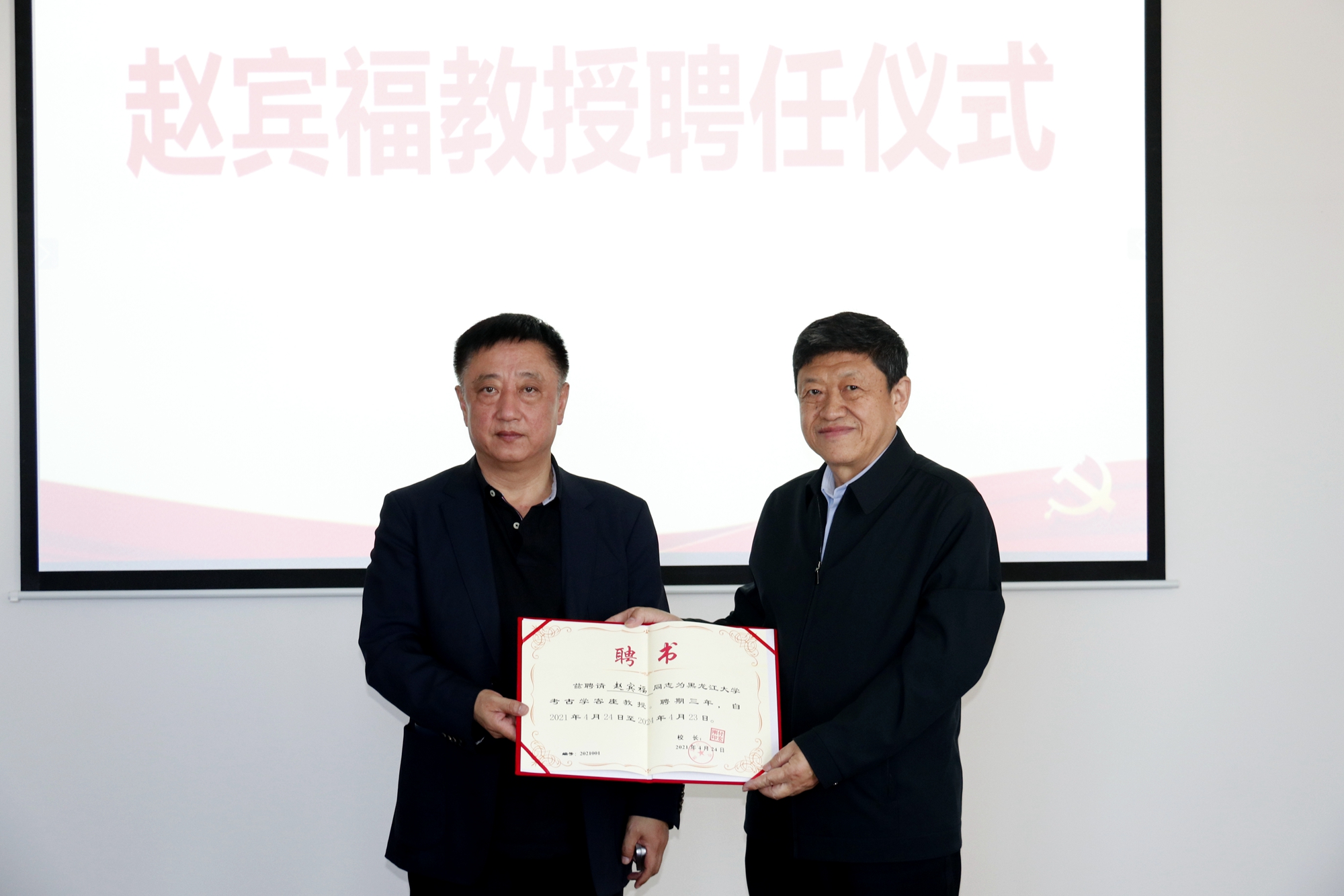 随后,人事处处长庞淑红宣读学校聘任决定。张颖春副校长为赵宾福教授颁发客座教授聘书,佩戴校徽。