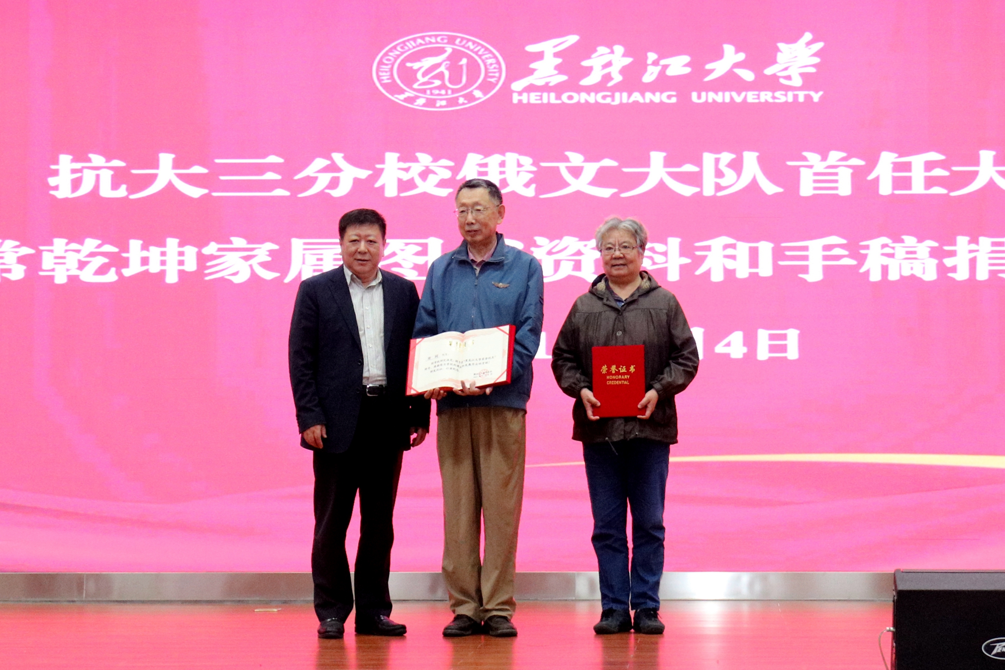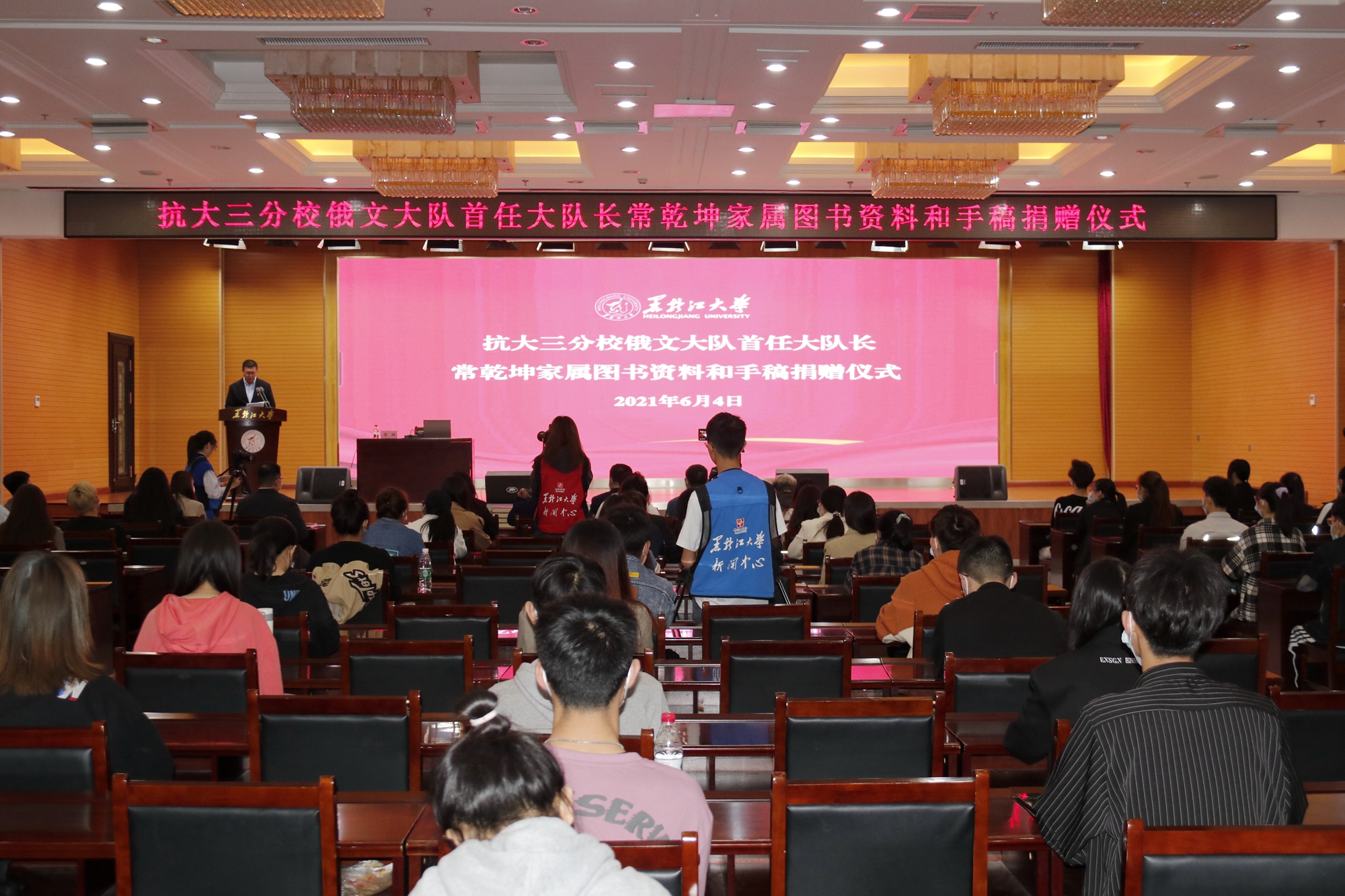 6月4日上午,我校在主楼一楼报告厅举行抗大三分校俄文大队首任大队长常乾坤家属图书资料和手稿捐赠仪式。常乾坤之子常砢先生、儿媳苏洮铭女士,我校党委书记王永清、副校长李卓,党委宣传部、校团委、俄语学院、电子工程学院等单位师生代表等出席仪式。本次仪式由电子工程学院党委书记杨其滨主持。