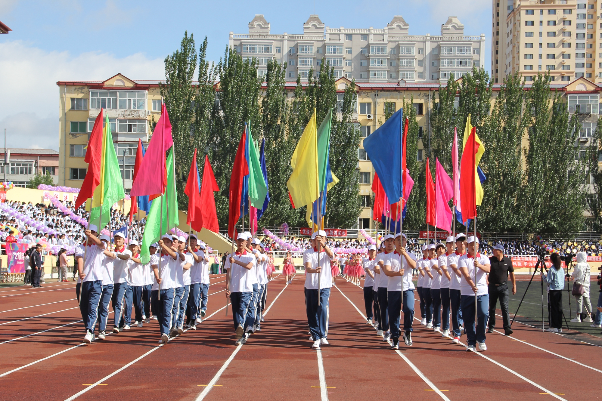 方阵检阅结束后,升国旗,升校旗,升会旗,全场齐唱国歌、校歌。