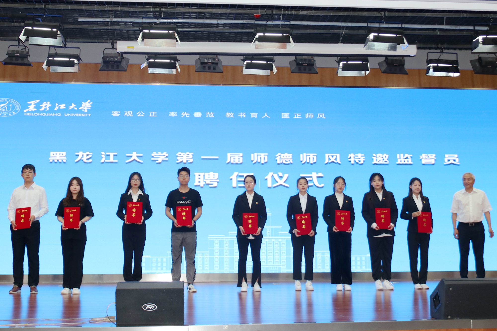 随后,梁东辉书记为在校学生特邀监督员颁发聘书,丁宏副书记为学校教学科研人员、党政管理人员特邀监督员颁发聘书,蒋晶洁副书记为民主党派老师、学生家长以及校友特邀监督员颁发聘书并合影留念。