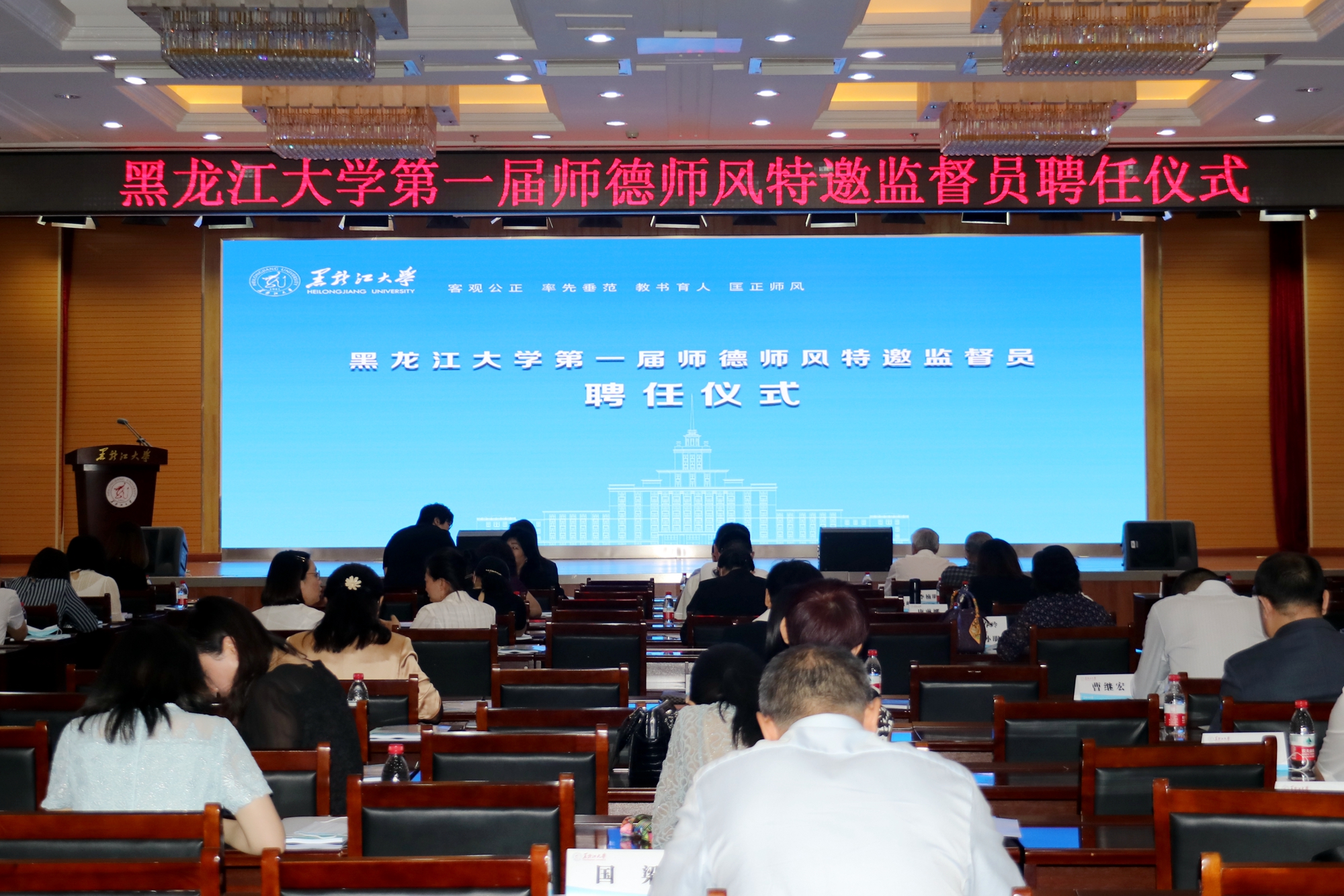 6月22日,我校在主楼一楼报告厅举行HG8088皇冠首届师德师风特邀监督员聘任仪式。校党委副书记蒋晶洁、丁宏,纪委书记梁东辉,校师德师风建设委员会成员、教学科研单位负责人,以及受聘特邀监督员参加会议。会议由党委教师工作部部长庞淑红主持。