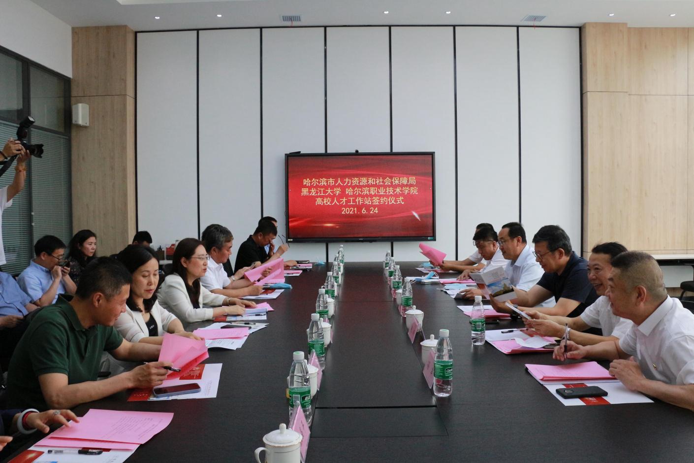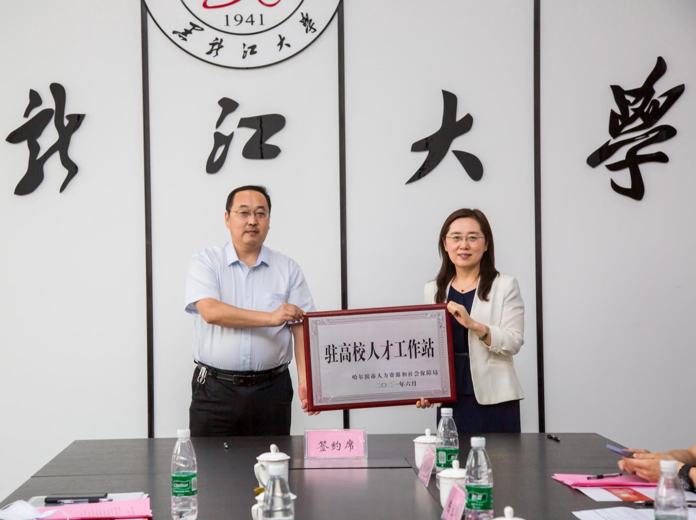 随后,我校党委副书记丁宏、哈尔滨职业技术学院党委副书记王海山分别与哈尔滨市人力资源服务中心主任杜忠家进行了《驻哈高校人才工作站协议书》的签约和授牌。