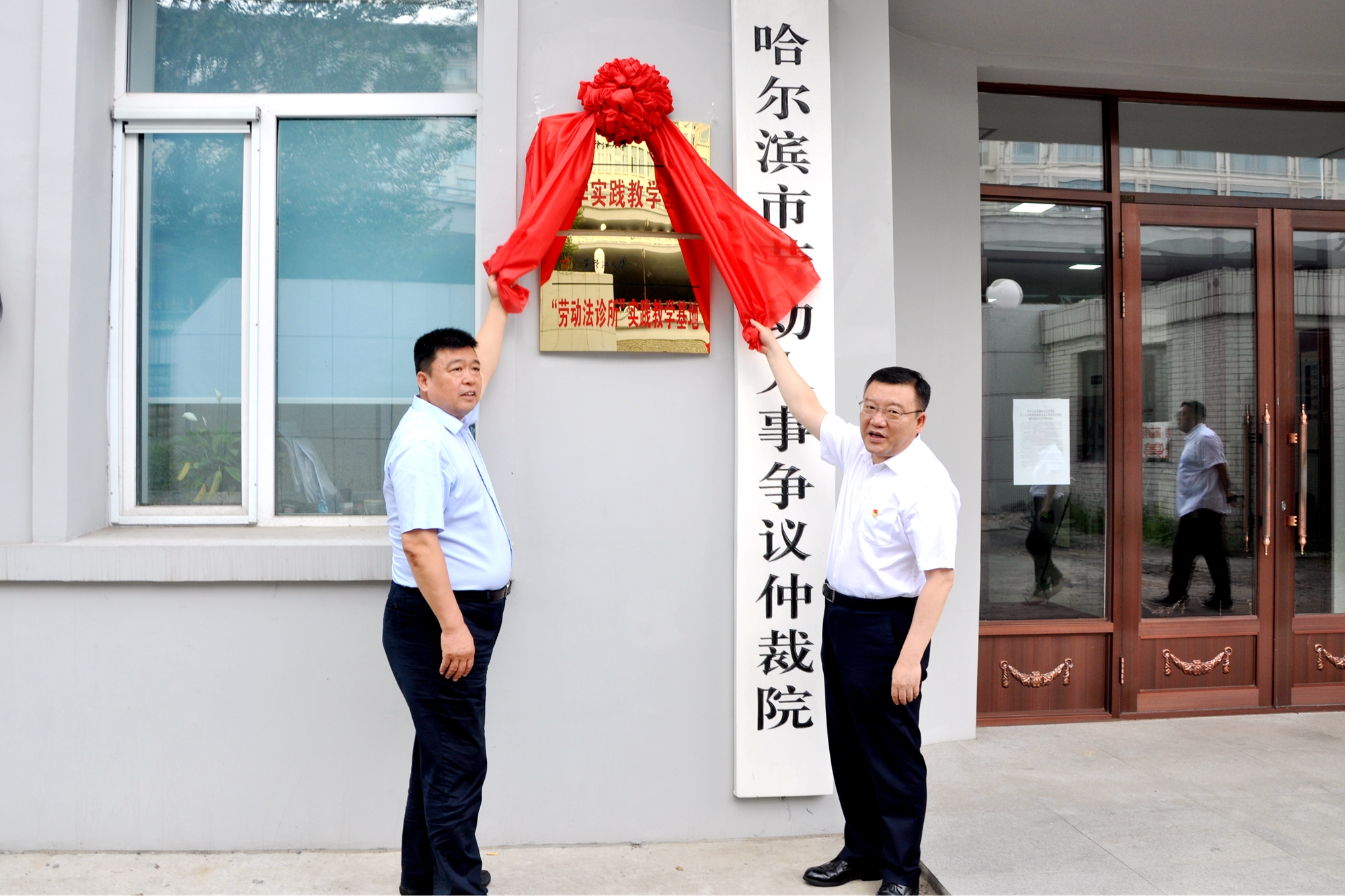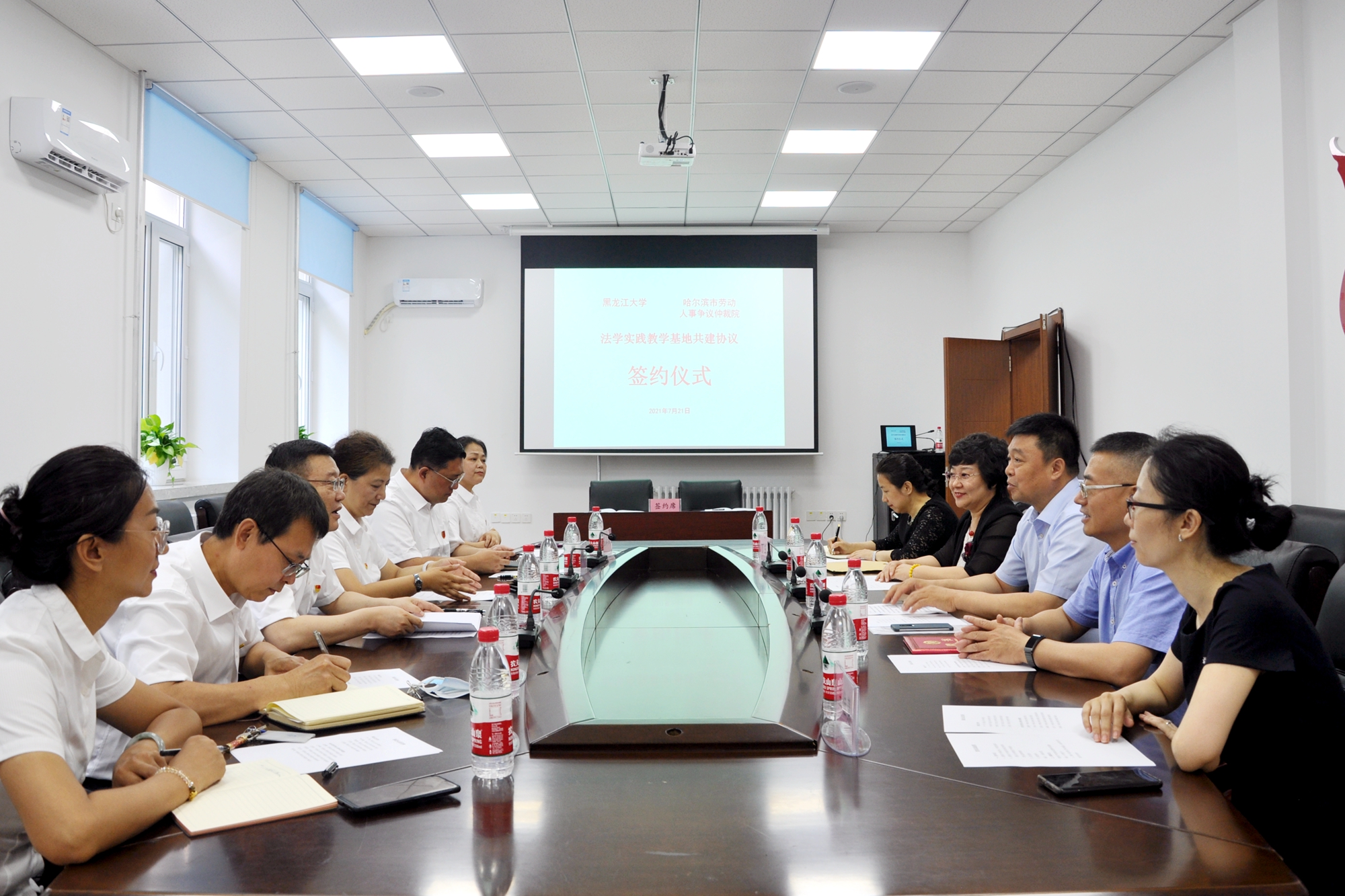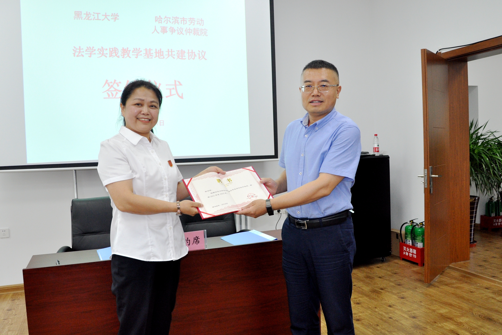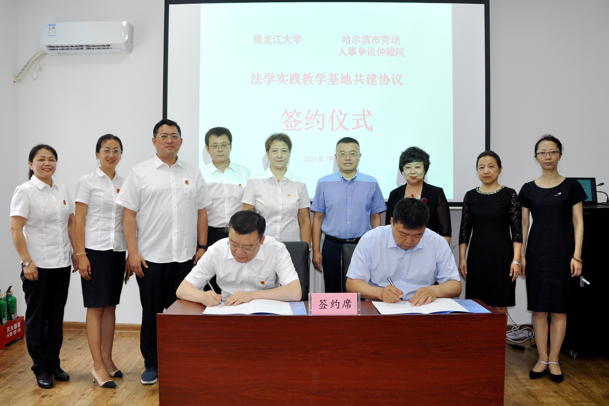 7月21日下午,HG8088皇冠与哈尔滨市劳动人事争议仲裁院共建法学实践教学基地签约揭牌仪式在哈尔滨市劳动人事争议仲裁院举行。我校副校长严明、哈尔滨市劳动人事争议仲裁院院长孟朝晖,我校法学院、研究生院相关负责同志、哈尔滨市劳动人事争议仲裁院相关同志参加签约仪式。哈尔滨市劳动人事争议仲裁院副院长于冬梅主持仪式。