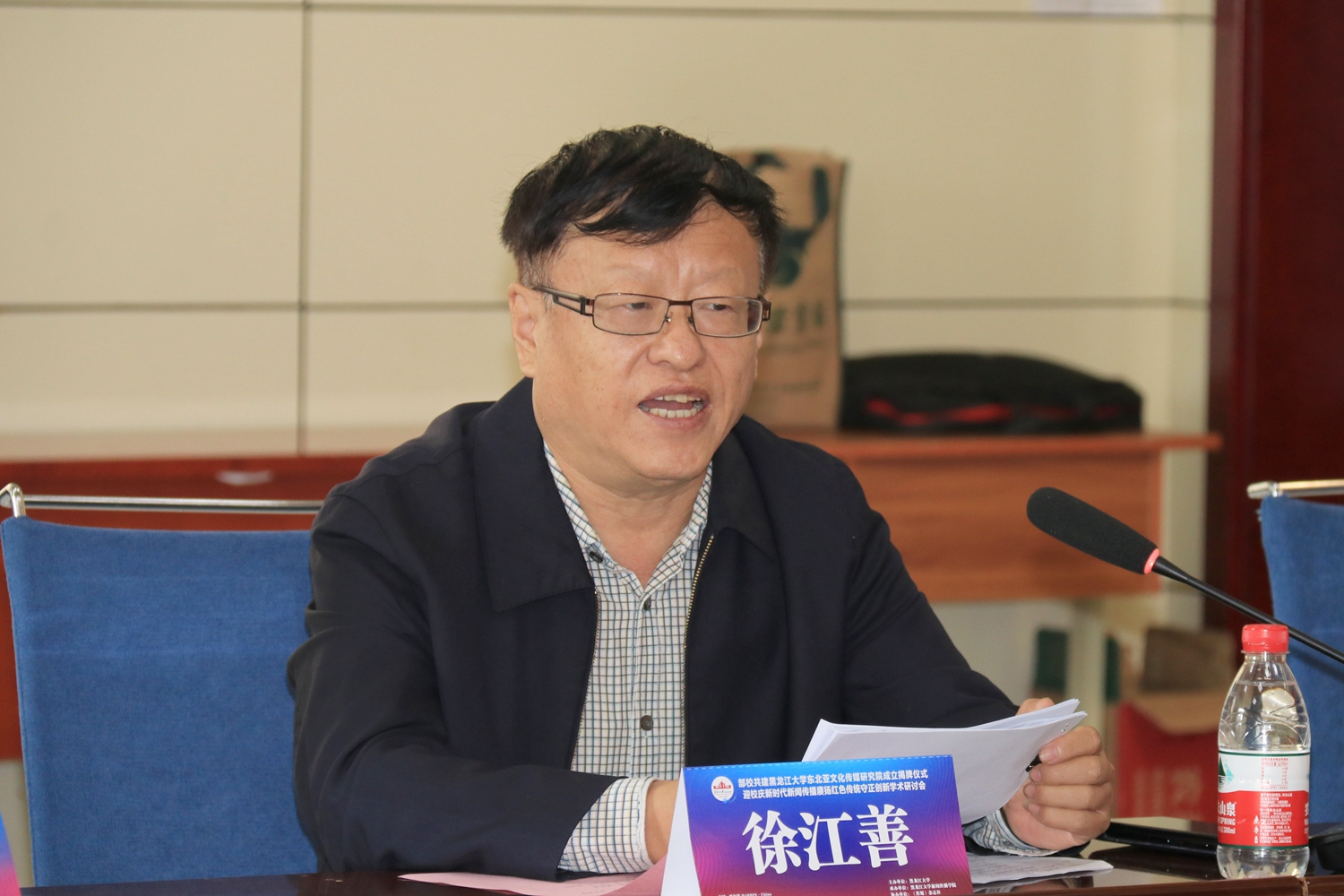 会上,新闻传播学院院长徐江善介绍部校共建东北亚文化传媒研究院的相关情况。他从三方面进行详细阐述,一是创立研究院的初衷是为了落实中央教育部文件精神,建立自控研究成果。二是新闻传播是一门实践性强的学科,研究院应发挥学界与业界结合的优势,利用前期准备,奠定坚实基础,发挥学科优势,克服不利因素。三是研究院的最终目的是为了培养人才,为各级党委和政府治理提供智力支持。他表示,研究院将坚持改革开放的思想引领,发挥服务龙江精神,把地方特色和文化传媒相结合,推动东北振兴。