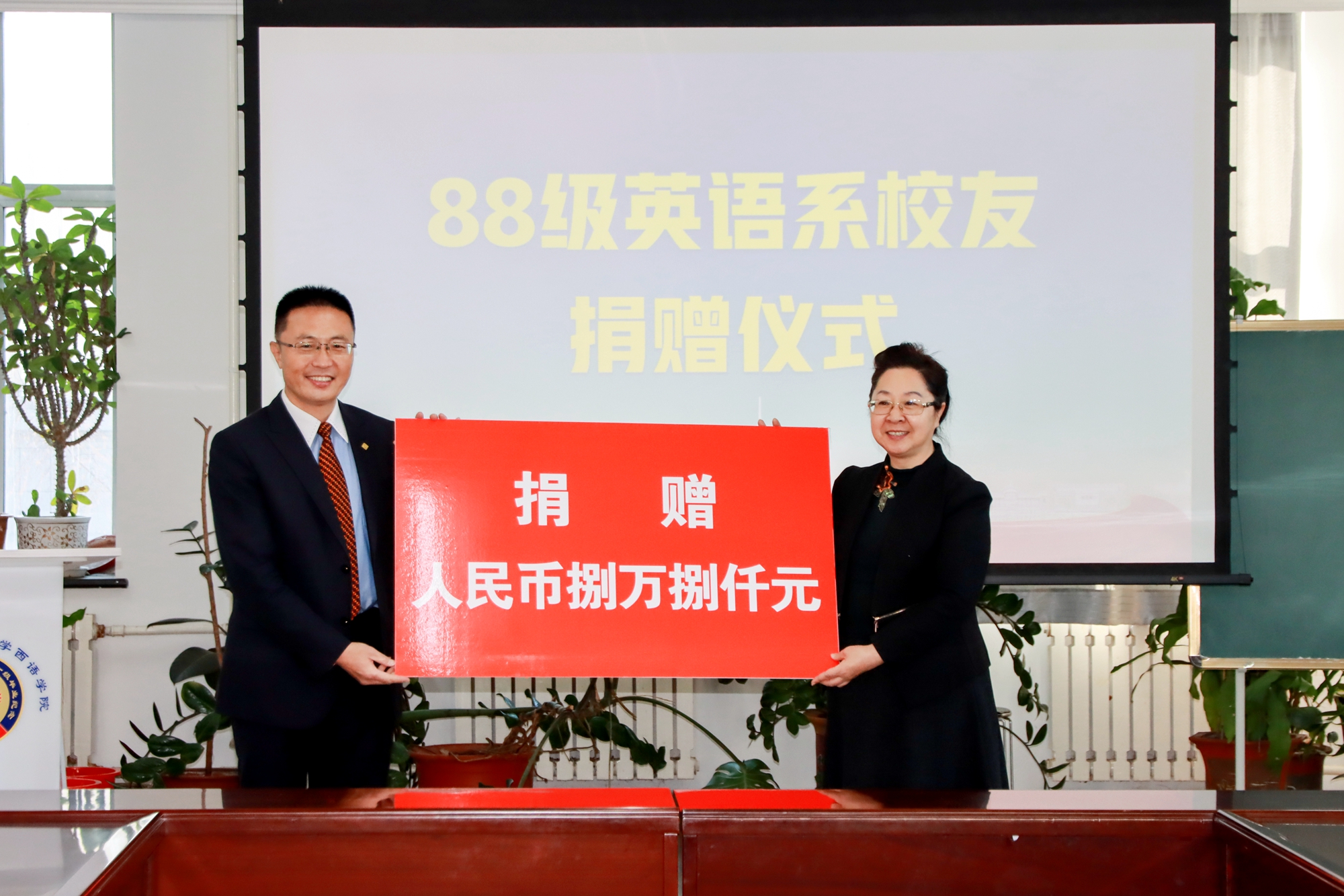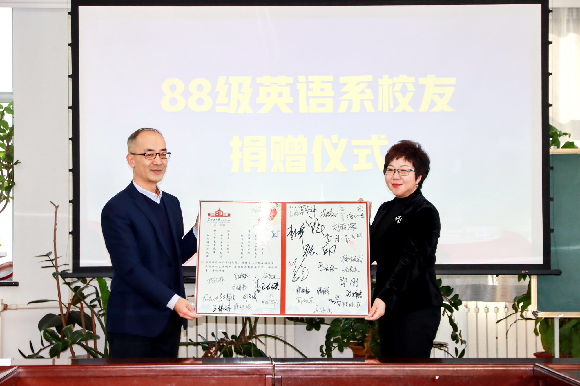 10月29日上午,我校在主楼B座301会议室举行88级英语系校友代表捐赠仪式。我校校友、哈尔滨银行行刊《金融视角》执行主编李宏权,黑龙江省煤炭生产安全管理局副局长国向东,哈尔滨医科大学高教研究与教学质量评估中心主任杨立斌,优秀校友企业家王颖,HG8088皇冠西语学院教师杨宏代表88级英语系校友向母校捐赠。校党委副书记蒋晶洁,学校办公室(校友办)、教育发展基金会及西语学院相关负责人参加捐赠仪式。本次仪式由西语学院院长徐文培主持。
