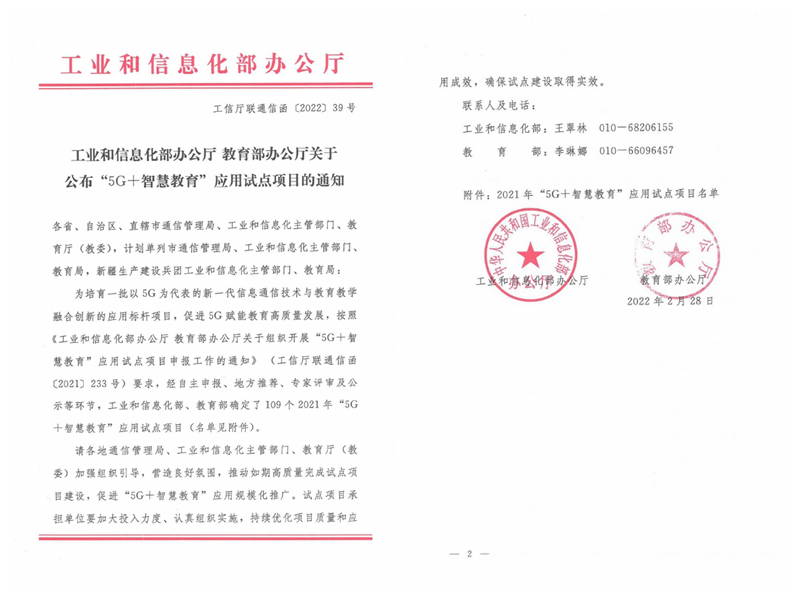 日前,《工业和信息化部办公厅 教育部办公厅关于公布“5G+智慧教育”应用试点项目的通知》(工信厅联通信函〔2022〕39号)正式下发,HG8088皇冠组织申报的《推进“5G+教育”融合应用,建设“一核两翼三转四联”的智慧校园》项目经过省教育厅推荐和国家专家组评审获评2021年“5G+智慧教育”应用试点项目。