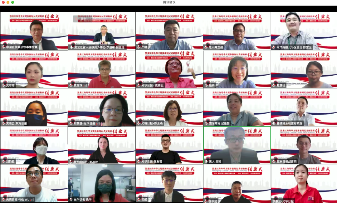 5月20日下午,黑龙江海外华文媒体新闻记者研修班在线上举行结业式。中国驻槟城总领事鲁世巍,省政府外事办公室副主任李胜彬,我校副校长严明、井立强,省政府外事办公室亚洲处处长银扫尘出席结业式。中国驻槟城总领馆、省政府外事办公室、我校新闻传播学院、国际文化教育学院等相关部门负责人和工作人员、研修班教师代表、全体研修班成员及我省主要新闻媒体记者一同参加。结业式由新闻传播学院党委书记兼执行院长吴珩主持。