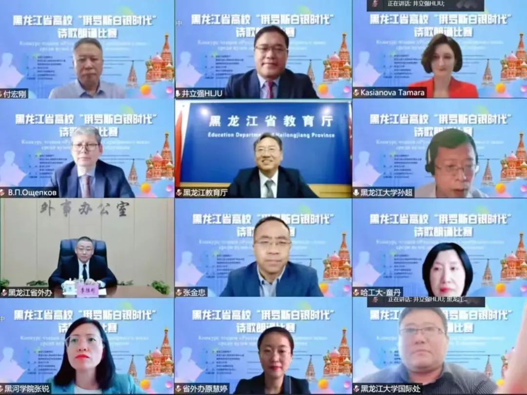 6月6日14时,黑龙江省高校“俄罗斯白银时代”诗歌朗诵比赛在云端举行。俄罗斯联邦驻哈尔滨总领馆总领事奥谢普科夫、北京俄罗斯文化中心主任卡西亚诺娃、省教育厅一级巡视员姜广福、黑龙江省人民政府外事办公室副主任李胜彬、校长付宏刚出席开幕式,大赛开幕式由副校长井立强主持,来自全省各高校的40余名学生参加比赛。