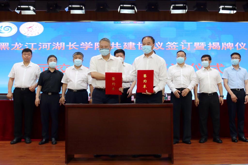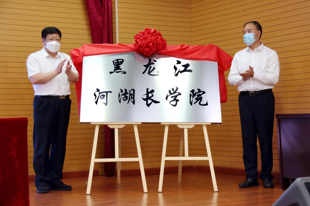 仪式上,侯百君厅长和付宏刚校长签订了共建协议,侯百君厅长和王永清书记为黑龙江河湖长学院揭牌。