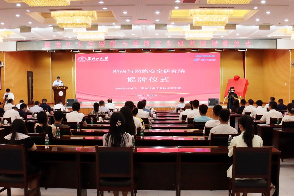 8月1日上午,我校在主楼一楼报告厅举行密码与网络安全研究院揭牌仪式。校党委书记王永清,省国家密码管理局局长黎广波,省工业技术研究院院长付强,黑龙江航天信息股份有限公司加密经济事业部总经理王申,黑龙江航天信息股份有限公司总经理任海鹏,校党委副书记丁宏,副校长严明出席本次揭牌仪式。揭牌仪式由副校长严明主持。