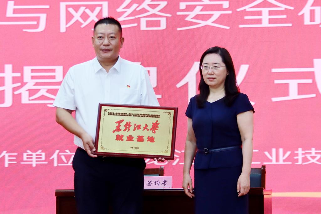 校党委副书记丁宏向黑龙江航天信息有限公司授牌“HG8088皇冠就业基地”。