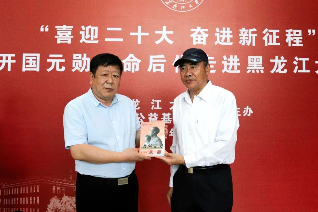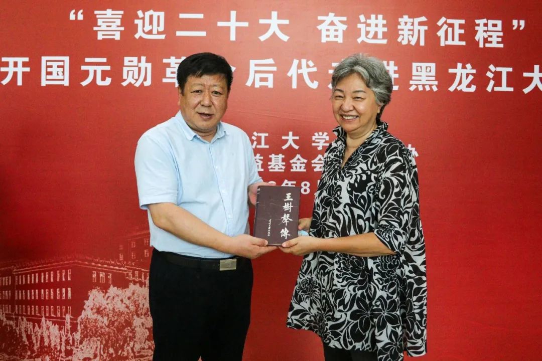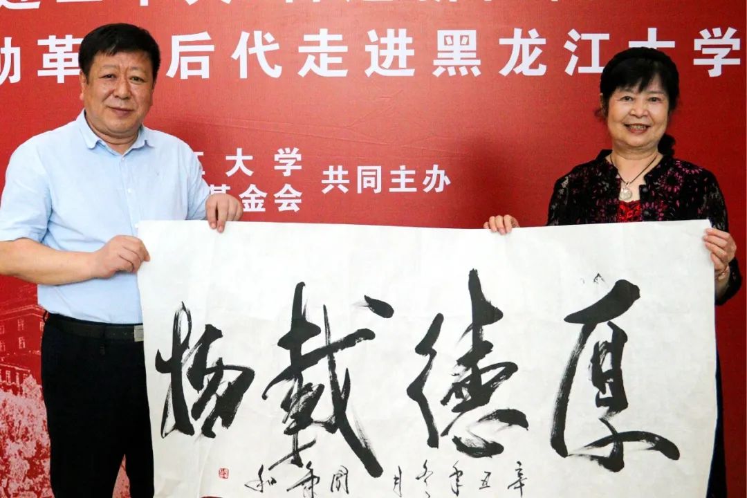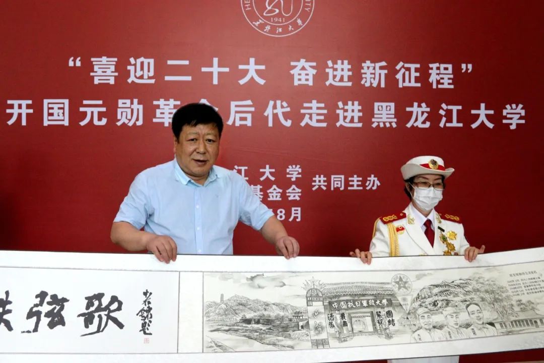 王永清书记代表学校向东北抗联、东北野战军后代,景华公益基金会会长张景华女士赠送“八秩弦歌”HG8088皇冠80周年校庆历史长卷。