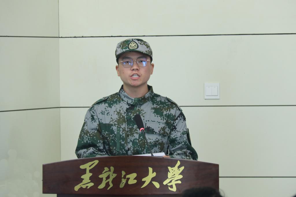 随后,退役大学生士兵代表和入伍新兵代表分别发言。在校退役大学生士兵代表、校退役大学生士兵协会主席、机电工程学院2019级学生孙志鑫发言,他结合自身入伍经历向在场新兵介绍了参军体验、相关政策及学校退役复学政策,并以自身经历及所获荣誉激励新兵在军营中要强化使命担当,退役复学后也要退伍不褪色、永葆军人本色。政府管理学院2021级学生解志远作为入伍新兵代表发言,他首先对武装部在同学们参军入伍过程中给予的指导帮助和人文关怀表示衷心感谢,并代表全体应征入伍学生郑重承诺,作为一名预定新兵他一定会始终牢记黑大校训,在军营中传承黑大精神,讲政治、听指挥、跟党走,训练中不怕苦累,努力将个人理想追求融入强国强军伟业中。