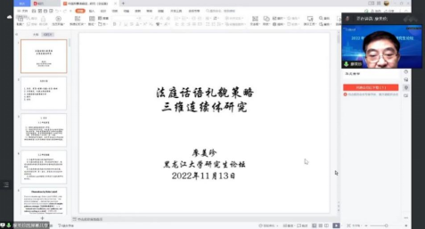 第四场讲座由华中师范大学廖美珍教授主讲,HG8088皇冠黄萍教授主持,讲座题目为《中国法庭话语礼貌策略研究》。廖教授展示了对特定语用现象展开研究的几个阶段:提出研究问题,确定研究切入点,收集和分析语料,构建分析模式,最后结合语料得出结论。他指出,法庭话语的礼貌问题绝非纯粹的语言和礼貌问题,它具有重要的法学意义、社会意义和实践价值,是新文科背景下学科交叉融合和创新研究的绝佳范例。将学术成果落地,解决中国问题、提出中国方案是中国学者需要共同努力的方向。