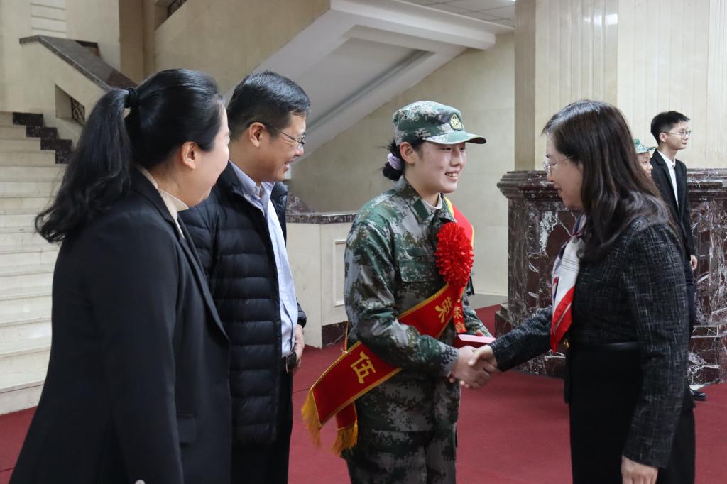 随后,出席领导、老师为预定女兵佩戴“光荣入伍”大红花、赠送校庆主题纪念书签。