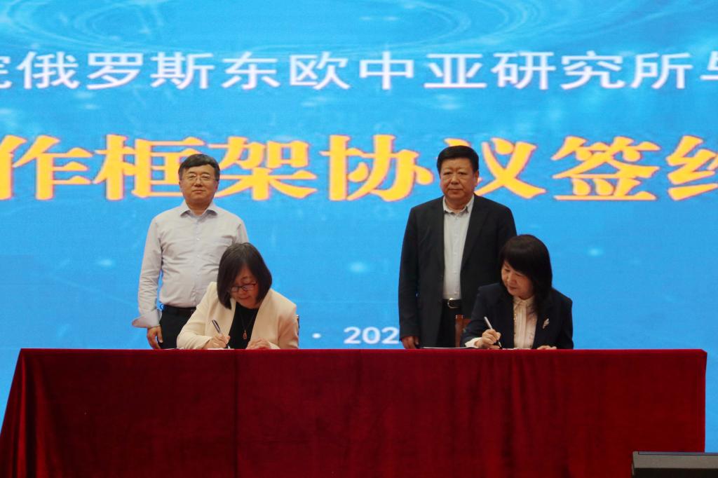 仪式上,金哲与于文秀代表双方签署《中国社会科学院俄罗斯东欧中亚研究所与HG8088皇冠战略合作框架协议》。