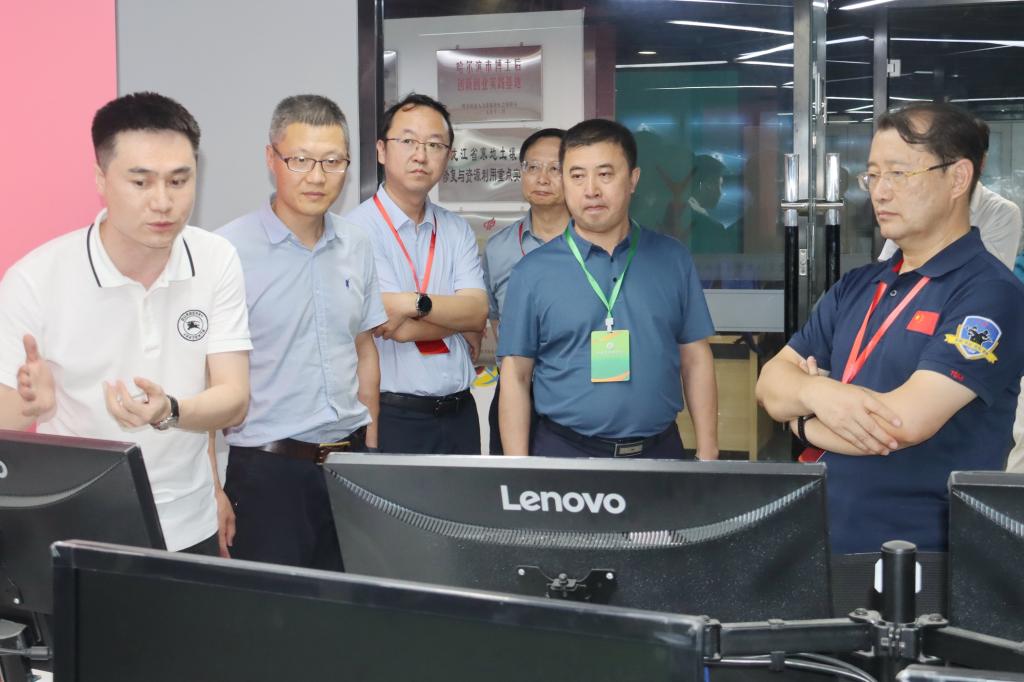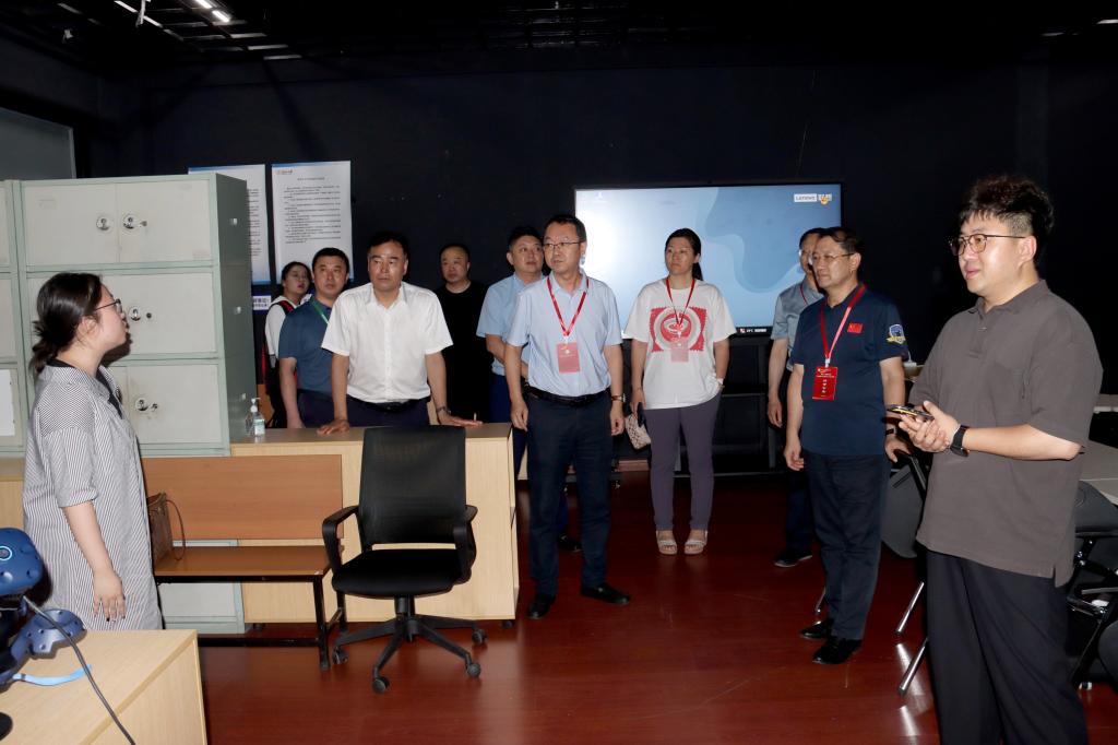 在汇文楼创客中心,讲解员向专家组介绍了创客中心的特色与成就,并向专家组介绍、展示虚拟仿真教学平台的使用以及在PC端的模拟销售为教学提供的沉浸式情景。