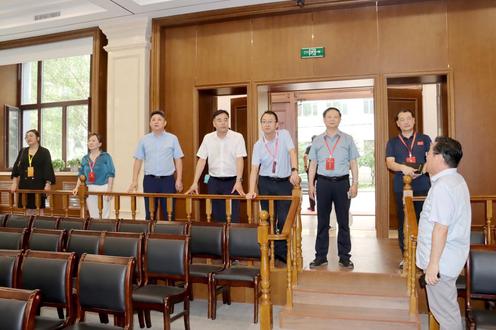 随后专家组一行走访参观我校模拟法庭、艺术楼数字化创意设计艺术实验中心、汇文楼创客中心。在模拟法庭,讲解员向专家组简要介绍了模拟法庭的基本情况,并表示将在模拟法庭开设公共法治大学堂,充分发挥其开放共享的作用。专家组成员对模拟法庭的建设表示充分肯定,并合影留念。