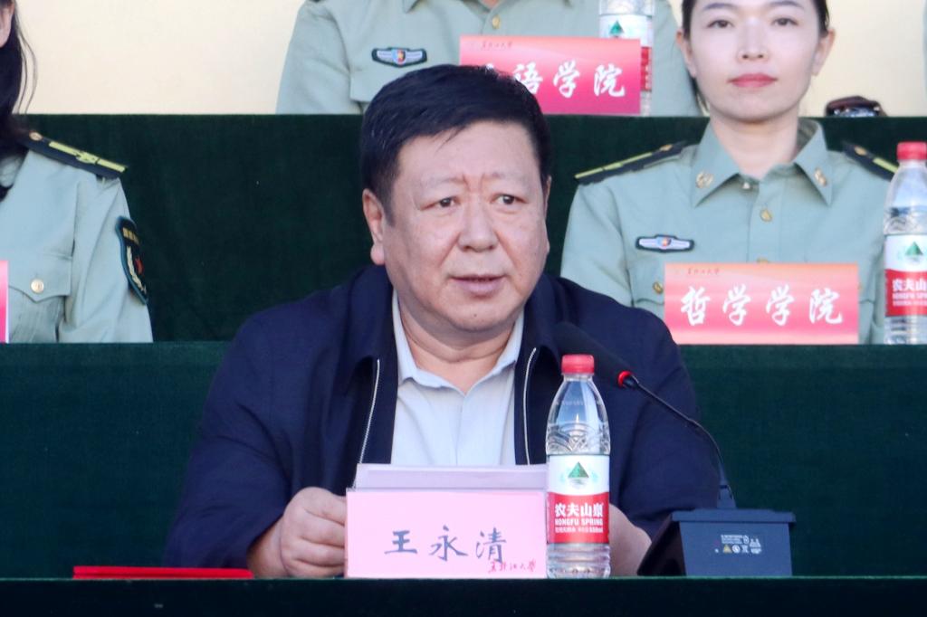 王永清作军训总结报告。他代表校党委对全体参训师生表示热烈的祝贺和诚挚的慰问。他指出,此次军训承训教官充分发扬了军人的优良传统和作风,率先垂范、不辞劳苦、正规施训、文明施训、安全施训,出色地完成了训练任务,为我校今后的军训工作积累了宝贵的经验。