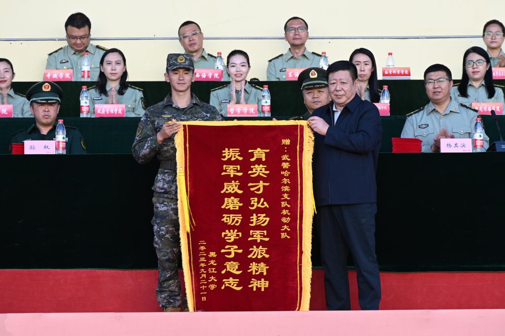 王永清代表学校向承训单位武警哈尔滨支队机动大队赠送了锦旗。