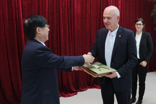 闫鹏飞副校长代表我校向以色列驻华大使一行赠送了别具民族特色的礼物,马腾·维尔奈大使随后来到西语学院,向我校2014级翻译2班的学生做了题为《以色列——创新的国度》的演讲。(摄影:杨凯)
