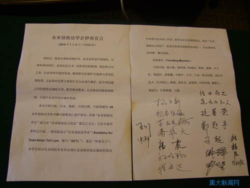 我校党委书记杨震出席会议并在 《东亚侵权法学会伊春宣言》上签字