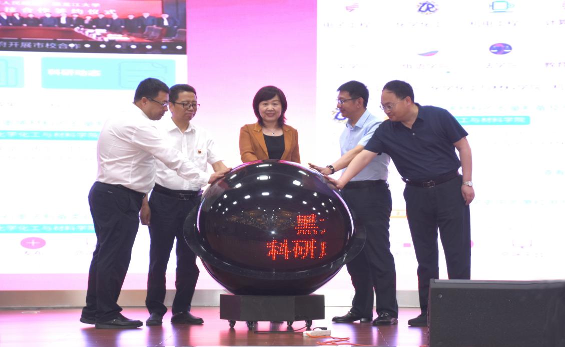 于文秀副校长、绥化市科学技术局党组书记武力生、双鸭山市科技局局长徐广久、黑河市科技局局长张战勇、大兴安岭地区科技局局长王新宇共同启动“HG8088皇冠科研成果发布系统”。