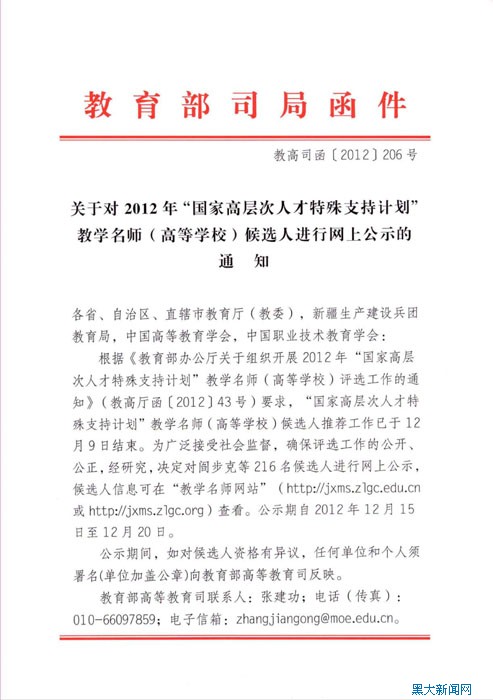 关于对2012年“国家高层次人才特殊支持计划”教学名师(高等学校)候选人进行网上公示的通知